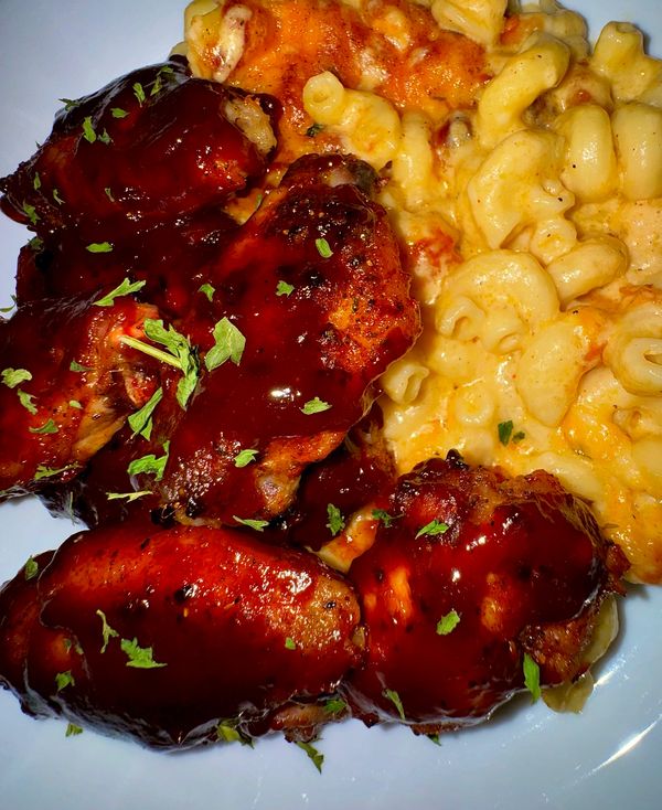 Chef Nelly’s Four Cheese Baked Mac w/ Roasted Honey BBQ sauced wings