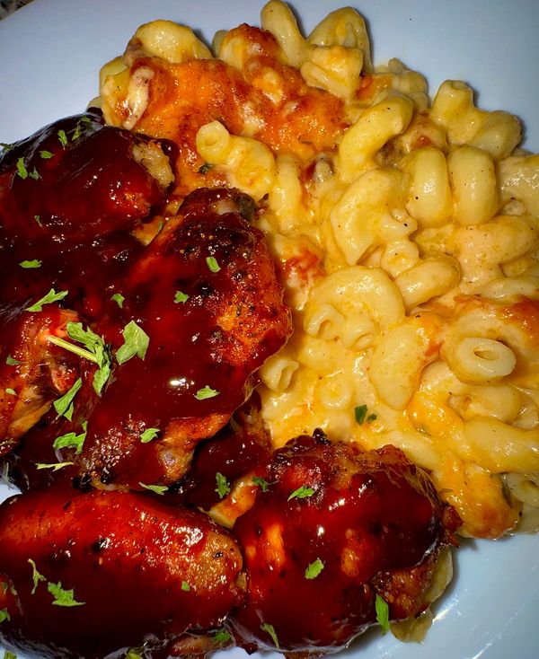 Nelly’s Four Cheese Baked Mac w/ Roasted Honey BBQ Wings
