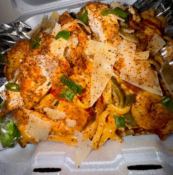 with Linguine, Sautéed Bell peppers, Onions, Sun-dried Tomatoes, and a trio of proteins: Shrimp, Chicken & Smoked Sausage. Finished with freshly grated shaved Parmesan and Pecorino Romano cheese. A rich, Southern-inspired masterpiece.