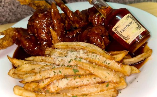 Sticky Hennessy BBQ Crispy Wings w/ Fresh-cut Garlic Parm Fries
